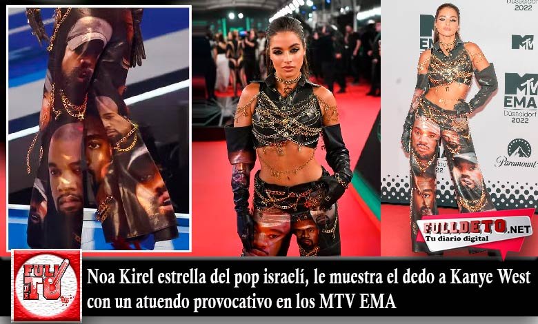 La estrella del pop israelí Noa Kirel llevó la conversación a los MTV EMA el domingo por la noche, apareciendo con un atuendo que dejaba al descubierto el estómago adornado con fotos de Kanye West, que ahora se hace llamar Ye, y enjoyado con la estrella judía de David. Kirel, un nombre familiar en su país natal que representará a Israel en el próximo Festival de la Canción de Eurovisión, fue nombrada mejor artista israelí por sexto año consecutivo. Ella dice que su look se trataba de hacer una declaración.